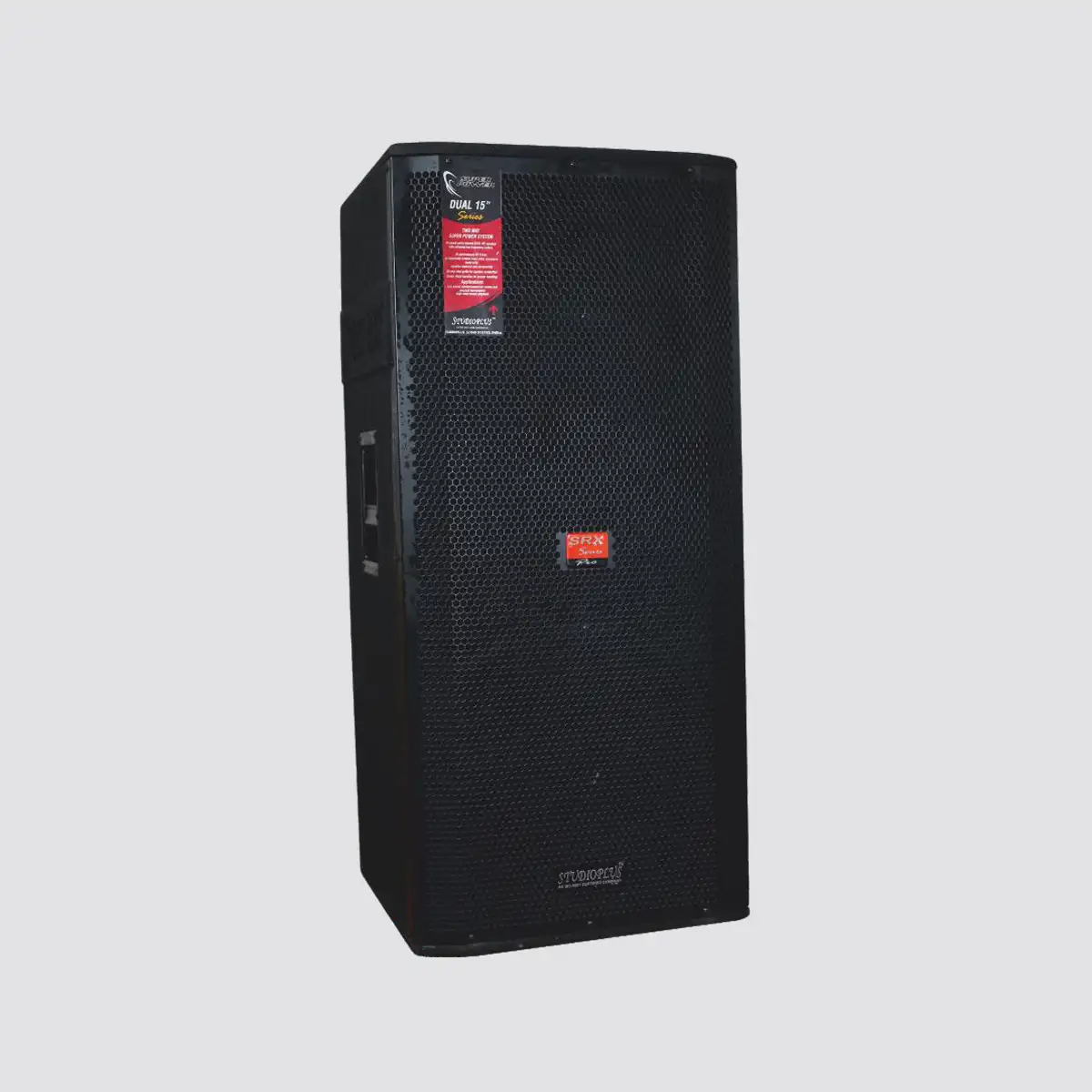 STUDIOPLUS professional 2-way speaker system with 12″ full range speaker and a dynamic horn tweeter with crossover network. these systems are housed in rugged bass reflex enclosure made of 18mm board covered in black finish carpet with perforated metal grill. These cabinets are supplied with heavy duty plastic corners and handles for easy transportation.